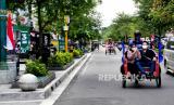 Becak membawa wisatawan berkeliling di kawasan wisata Malioboro, Yogyakarta, Ahad (22/8). Setelah sebelumnya sepi pengunjung, kini wisatawan mulai mendatangi kawasan wisata Malioboro sejak adanya pelonggaran PPKM Level 4. Sepekan terakhir, pedagang dan pelaku wisata di Malioboro juga sudah kembali beraktivitas. (FOTO : Wihdan Hidayat / Republika)