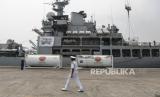 Seorang perwira Angkatan Laut India melintas saat bongkar muat tangki berisi oksigen medis cair dari INS Airavat (L24) di Pelabuhan Tanjung Priok, Jakarta, Selasa (24/8/2021). Pemerintah India memberikan bantuan berupa 10 ISO Cryogenic Tanks berkapasitas 20 metrik ton oksigen cari kepada Indonesia. (FOTO : ANTARA/M Risyal Hidayat)