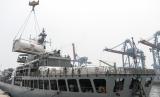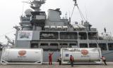 REPUBLIKA.CO.ID,Petugas membongkar muat tangki berisi oksigen medis cair dari kapal perang Angkatan Laut India (INS) Airavat (L24) di Pelabuhan Tanjung Priok, Jakarta, Selasa (24/8/2021).