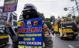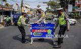 Petugas kepolisian membawa papan informasi saat uji coba pemberlakuan ganjil genap di Jalan Sangkuriang, Padasuka, Kota Cimahi, Selasa (24/8). Satlantas Polres Cimahi bersama Dishub Kota Cimahi melakukan uji coba pemberlakuan ganjil genap di sejumlah ruas jalan protokol di Kota Cimahi yang bertujuan untuk menekan mobilitas masyarakat guna meminimalisir penyebaran Covid-19 di masa perpanjangan PPKM. Foto: Republika/Abdan Syakura (FOTO : REPUBLIKA/ABDAN SYAKURA)