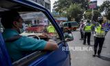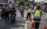 Petugas kepolisian menghentikan pengendara saat uji coba pemberlakuan ganjil genap di Jalan Sangkuriang, Padasuka, Kota Cimahi, Selasa (24/8). Satlantas Polres Cimahi bersama Dishub Kota Cimahi melakukan uji coba pemberlakuan ganjil genap di sejumlah ruas jalan protokol di Kota Cimahi yang bertujuan untuk menekan mobilitas masyarakat guna meminimalisir penyebaran Covid-19 di masa perpanjangan PPKM. (FOTO : REPUBLIKA/ABDAN SYAKURA)