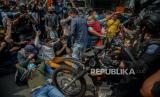 Massa dari Pencari Suaka asal Afghanistan melakukan aksi di depan kantor Komisi Tinggi PBB untuk Pengungsi (UNHCR), Kebon Sirih, Jakarta, Selasa (24/8). Dalam aksinya, massa menuntut kejelasan kepada UNHCR terakit status penempatan pencari suaka di negara ketiga. Aksi tersebut dibubarkan aparat kepolisian untuk menghindari kerumunan pada masa PPKM level 3 di Jakarta. (FOTO : Republika/Thoudy Badai)