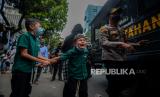 Petugas kepolisian menggunakan pakaian Alat Pelindung Diri (APD) membubarkan massa dari Pencari Suaka asal Afghanistan saat melakukan aksi di depan kantor Komisi Tinggi PBB untuk Pengungsi (UNHCR), Kebon Sirih, Jakarta, Selasa (24/8). Dalam aksinya, massa menuntut kejelasan kepada UNHCR terakit status penempatan pencari suaka di negara ketiga. Aksi tersebut dibubarkan aparat kepolisian untuk menghindari kerumunan pada masa PPKM level 3 di Jakarta. (FOTO : Republika/Thoudy Badai)