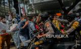 Petugas kepolisian membubarkan massa dari Pencari Suaka asal Afghanistan saat melakukan aksi di depan kantor Komisi Tinggi PBB untuk Pengungsi (UNHCR), Kebon Sirih, Jakarta, Selasa (24/8). Dalam aksinya, massa menuntut kejelasan kepada UNHCR terakit status penempatan pencari suaka di negara ketiga. Aksi tersebut dibubarkan aparat kepolisian untuk menghindari kerumunan pada masa PPKM level 3 di Jakarta. (FOTO : Republika/Thoudy Badai)