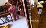 Pemilik merapihkan kain lurik di Tenun Lurik Kurnia, Yogyakarta, Rabu (25/8). Pemberlakuan PPKM Darurat beberapa waktu lalu memukul penjualan kain lurik di sini. Namun, kini penjualan mulai pulih kembali seiring pelonggaran saat perpanjangan PPKM. Demi mematuhi protokol kesehatan, karyawan dibagi menjadi dua shift kerja. (FOTO : Wihdan Hidayat / Republika)