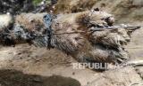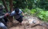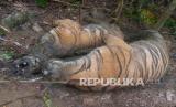 Dua ekor harimau Sumatera (Panthera tigris sumatrae) ditemukan mati di kawasan hutan Gampong Ibuboeh, Kecamatan Meukek, Aceh Selatan, Aceh, Rabu (25/8/2021). Sebanyak tiga ekor Harimau Sumatera yang terdiri dari satu ekor induk harimau dan dua anak harimau (satu betina dan satu jantan) ditemukan mati diduga akibat terkena jeratan babi. (FOTO : Antara/Hasan)