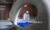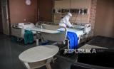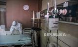 Tenaga kesehatan merapikan tempat tidur pasien di Ruang Isolasi Zam-Zam di RSUD Al-Ihsan, Baleendah, Kabupaten Bandung, Jumat (27/8). Berdasarkan data dari Pusat Informasi dan Koordinasi Covid-19 Provinsi Jawa Barat (Pikobar) pada (26/8), tingkat keterisian tempat tidur atau Bed Occupancy Rate (BOR) rumah sakit yang melayani Covid-19 dan tidak melayani Covid-19 mengalami penurunan dengan total keterisian 19,92 persen dibandingkan dengan bulan lalu yang mencapai 91,12 persen. Foto: Republika/Abdan Syakura (FOTO : REPUBLIKA/ABDAN SYAKURA)