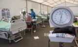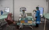 Pasien Covid-19 bersama keluarga berada di Posko Covid-19 RSUD Al-Ihsan, Baleendah, Kabupaten Bandung, Jumat (27/8). Berdasarkan data dari Pusat Informasi dan Koordinasi Covid-19 Provinsi Jawa Barat (Pikobar) pada (26/8), tingkat keterisian tempat tidur atau Bed Occupancy Rate (BOR) rumah sakit yang melayani Covid-19 dan tidak melayani Covid-19 mengalami penurunan dengan total keterisian 19,92 persen dibandingkan dengan bulan lalu yang mencapai 91,12 persen. Foto: Republika/Abdan Syakura (FOTO : REPUBLIKA/ABDAN SYAKURA)