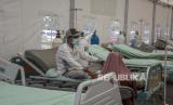 Tenaga kesehatan memeriksa kondisi kesehatan pasien Covid-19 di Posko Covid-19 RSUD Al-Ihsan, Baleendah, Kabupaten Bandung, Jumat (27/8). Berdasarkan data dari Pusat Informasi dan Koordinasi Covid-19 Provinsi Jawa Barat (Pikobar) pada (26/8), tingkat keterisian tempat tidur atau Bed Occupancy Rate (BOR) rumah sakit yang melayani Covid-19 dan tidak melayani Covid-19 mengalami penurunan dengan total keterisian 19,92 persen dibandingkan dengan bulan lalu yang mencapai 91,12 persen. (FOTO : REPUBLIKA/ABDAN SYAKURA)