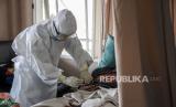 Tenaga kesehatan memeriksa kondisi kesehatan pasien Covid-19 di Ruang Isolasi Zam-Zam di RSUD Al-Ihsan, Baleendah, Kabupaten Bandung, Jumat (27/8). Berdasarkan data dari Pusat Informasi dan Koordinasi Covid-19 Provinsi Jawa Barat (Pikobar) pada (26/8), tingkat keterisian tempat tidur atau Bed Occupancy Rate (BOR) rumah sakit yang melayani Covid-19 dan tidak melayani Covid-19 mengalami penurunan dengan total keterisian 19,92 persen dibandingkan dengan bulan lalu yang mencapai 91,12 persen. Foto: Republika/Abdan Syakura (FOTO : REPUBLIKA/ABDAN SYAKURA)