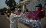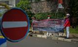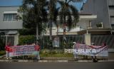 Sejumlah warga Taman Villa Meruya membentangkan spanduk sebagai bentuk aksi penolakan pembangunan Masjid At-Tabayyun di Perumahan Taman Villa Meruya, Meruya, Jakarta, Jumat (27/8). Penolakan tersebut dilakukan warga karena diduga terjadi alih fungsi lahan hijau untuk pembangunan Masjid At-Tabayyun di perumahan Taman Villa Meruya. Meski demikian, pihak panitia mengklaim sudah mengantongi izin dari berbagai lembaga keagamaan, pemerintahan setempat, dan Pemprov DKI Jakarta terkait proses pembangunan Masjid At-Tabayyun. Republika/Thoudy Badai (FOTO : Republika/Thoudy Badai)