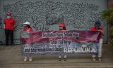 Sejumlah warga Taman Villa Meruya membentangkan spanduk sebagai bentuk aksi penolakan pembangunan Masjid At-Tabayyun di Perumahan Taman Villa Meruya, Meruya, Jakarta, Jumat (27/8). Penolakan tersebut dilakukan warga karena diduga terjadi alih fungsi lahan hijau untuk pembangunan Masjid At-Tabayyun di perumahan Taman Villa Meruya. Meski demikian, pihak panitia mengklaim sudah mengantongi izin dari berbagai lembaga keagamaan, pemerintahan setempat, dan Pemprov DKI Jakarta terkait proses pembangunan Masjid At-Tabayyun. (FOTO : Republika/Thoudy Badai)