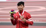 REPUBLIKA.CO.ID, TOKYO -- Pelari Indonesia Sapto Yogo Purnomo berpose dengan medali perunggu nomor lari 100 meter Paralimpiade Tokyo 2020 di Stadion Nasional Tokyo, jepang, Jumat (27/8/2021). Sapto meraih medali perunggu setelah finish di posisi ketiga dengan catatan waktu 11,31 detik, sementara medali emas diraih pelari Amerika Serikat Mayhugh dan medali perak diraih pelari Rusia Kobesov.