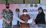 Konsul Jenderal Australia di Bali Anthea Griffin (kanan) didampingi Atase Pertahanan Laut Australia untuk Indonesia Capt. Rod Griffiths (kiri) melakukan proses serah terima dokumen bantuan mesin desalinasi air yang diangkut dari Australia menggunakan kapal AL Australia HMAS Canberra kepada Ketua Yayasan Pendidikan Wisata Darma Bali Gede Putu Surya Wirawan (kedua kanan) dan Kepala SMA Wisata Darma Gede Ngurah Surya Hadinata (kedua kiri) di Pulau Nusa Lembongan, Klungkung, Bali, Minggu (29/8/2021). (FOTO : ANTARA/FIKRI YUSUF)