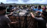 Warga memindahkan mesin desalinasi air yang diangkut dari Australia menggunakan kapal AL Australia HMAS Canberra di Pulau Nusa Lembongan, Klungkung, Bali, Minggu (29/8/2021). Bantuan mesin desalinasi air tenaga surya yang inisiasi Surfrider Foundation Australia dengan dana dan dukungan pemerintah Australia itu dihibahkan kepada Yayasan Pendidikan Wisata Darma Bali (SMA Wisata Darma) untuk membantu kebutuhan air minum bersih bagi masyarakat sekitar dengan memanfaatkan air laut yang diolah dengan mesin tersebut sekaligus untuk mengurangi penggunaan plastik sekali pakai dari air mineral kemasan. (FOTO : ANTARA/FIKRI YUSUF)