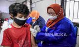 Vaksinator menyuntikan vaksin Covid-19 ke seorang anak saat pelaksanaan vaksinasi Covid-19 massal di Puskesmas Griya Antapani, Senin (30/8). Pemerintah Kota Bandung menyatakan program vaksinasi Covid-19 dosis pertama di Kota Bandung telah mencapai 60,68 persen atau 1.184.747 orang dan dosis kedua mencapai 38,24 persen atau 746.517 sementara dosis ketiga mencapai 0,49 persen atau 9.560 orang dari keseluruhan total target sasaran 1.952.352 orang. Foto: Republika/Abdan Syakura (FOTO : REPUBLIKA/ABDAN SYAKURA)