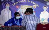 Vaksinator menyuntikan vaksin Covid-19 ke warga saat pelaksanaan vaksinasi Covid-19 massal di Puskesmas Griya Antapani, Senin (30/8). Pemerintah Kota Bandung menyatakan program vaksinasi Covid-19 dosis pertama di Kota Bandung telah mencapai 60,68 persen atau 1.184.747 orang dan dosis kedua mencapai 38,24 persen atau 746.517 sementara dosis ketiga mencapai 0,49 persen atau 9.560 orang dari keseluruhan total target sasaran 1.952.352 orang. Foto: Republika/Abdan Syakura (FOTO : REPUBLIKA/ABDAN SYAKURA)