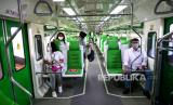 Penumpang Kereta Api Bandara YIA saat uji coba sarana rangkaian kereta di Stasiun Kereta Api Bandara YIA, Kulonprogo, Yogyakarta, Senin (30/8). Rencananya KA Bandara YIA mulai beroperasi komersil pada September mendatang. Waktu tempuh menuju Bandara YIA dari Stasiun Yogyakarta selama 39 menit. Tarif yang diberlakukan pada awal operasional nanti sebesar Rp 20 ribu untuk sekali perjalanan. (FOTO : Wihdan Hidayat / Republika)