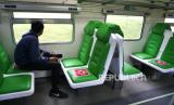 Bagian dalam gerbong Kereta Api Bandara YIA saat uji coba sarana rangkaian kereta di Stasiun Kereta Api Bandara YIA, Kulonprogo, Yogyakarta, Senin (30/8). Rencananya KA Bandara YIA mulai beroperasi komersil pada September mendatang. Waktu tempuh menuju Bandara YIA dari Stasiun Yogyakarta selama 39 menit. Tarif yang diberlakukan pada awal operasional nanti sebesar Rp 20 ribu untuk sekali perjalanan. (FOTO : Wihdan Hidayat / Republika)