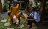 Anak kembar siam Al Putri Dewi Ningsih dan Al Putri Anugrah digendong oleh ayahnya di Bandung, Jawa Barat, Senin (30/8/2021). Putri dan Dewi yang berusia delapan tahun tersebut datang bersama keluarga ke Kota Bandung dari Garut untuk melakukan pemeriksaan kesehatan dan pengukuran pembuatan kursi roda khusus yang mampu membantu mereka beraktivitas dan sekolah. (FOTO : ANTARA/NOVRIAN ARBI)