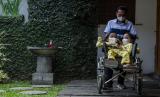 Anak kembar siam Al Putri Dewi Ningsih dan Al Putri Anugrah duduk di atas kursi roda yang didorong ayahnya di Bandung, Jawa Barat, Senin (30/8/2021). Putri dan Dewi yang berusia delapan tahun tersebut datang bersama keluarga ke Kota Bandung dari Garut untuk melakukan pemeriksaan kesehatan dan pengukuran pembuatan kursi roda khusus yang mampu membantu mereka beraktivitas dan sekolah. (FOTO : ANTARA/NOVRIAN ARBI)