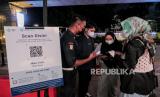 Petugas memeriksa sertifikat vaksin sebelum memasuki kawasan Mbloc Space, Jakarta, Selasa (31/8). Pada masa perpanjangan pelonggaran PPKM level 3 di DKI Jakarta yang berlangsung hingga 6 September 2021 mendatang pemerintah memberikan kelonggaran bagi restoran dan pusat perbelanjaan maksimum kapasitas 50 persen dari semula hanya 25 persen dan jam operasional hingga 21.00 WIB. Kawasan Mbloc Space mulai beroperasi kembali dengan mewajibkan pengunjung memiliki sertifikat vaksin yang diakses melalui aplikasi pedulilindungi.id serta menerapkan protokol kesehatan yang ketat. (FOTO : Republika/Thoudy Badai)
