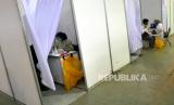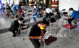 Warga mengisi formulir sebelum vaksinasi Covid-19 di Sentra Vaksinasi JEC, Yogyakarta, Rabu (1/9). Sentra vaksinasi Covid-19 yang bekerja sama dengan Tiket.com ini menyediakan 3 ribu dosis setiap hari selama seminggu. Saat ini rata-rata cakupan vaksinasi Covid-19 di Yogyakarta sudah mencapai 32 ribu dosis per hari. Berarti melewati target provinsi yang ditetapkan yakni 20 ribu dosis per hari. (FOTO : Wihdan Hidayat / Republika)