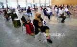 Warga antre mengikuti vaksinasi Covid-19 di Sentra Vaksinasi JEC, Yogyakarta, Rabu (1/9). Sentra vaksinasi Covid-19 yang bekerja sama dengan Tiket.com ini menyediakan 3 ribu dosis setiap hari selama seminggu. Saat ini rata-rata cakupan vaksinasi Covid-19 di Yogyakarta sudah mencapai 32 ribu dosis per hari. Berarti melewati target provinsi yang ditetapkan yakni 20 ribu dosis per hari. (FOTO : Wihdan Hidayat / Republika)