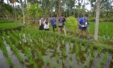 Sejumlah petugas Dinas Kependudukan dan Catatan Sipil melewati pematang sawah sambil membawa alat perekaman data KTP elektronik di Nagari Tandikek, Kabupaten Padangpariaman, Sumatera Barat, Rabu (1/9/2021). Dinas Kependudukan dan Catatan Sipil Padangpariaman berinovasi dengan pelayanan perekaman KTP elektronik Tunggu di Rumah Saja khusus bagi lansia, penyandang disabilitas, orang sakit dan orang dengan gangguan jiwa (ODGJ) (FOTO : ANTARA/Iggoy el Fitra)