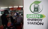Petugas membatu mengisi bahan bakar minyak (BBM) pada sebuah kendaraan di SPBU Green Energy Station Fatmawati, Jakarta, Rabu (1/9). Green Energy Station (GES) SPBU Berkonsep Ramah Lingkungan merupakan suatu layanan terintegrasi bagi konsumen di SPBU Pertamina dengan empat (4) konsep utama, yakni Green, Future, Digital, dan High Tier Fuel. (FOTO : Prayogi/Republika.)