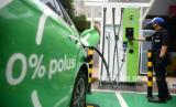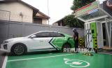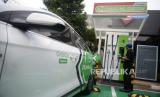 Petugas membatu mengisi daya mobil listrik di SPBU Green Energy Station Fatmawati, Jakarta, Rabu (1/9). (FOTO : Prayogi/Republika.)