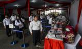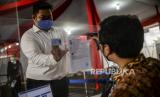 Petugas memeriksa dokumen peserta tes Seleksi Kemampuan Dasar (SKD) Calon Pegawai Negeri Sipil (CPNS) di Kantor Badan Kepegawaian Negara (BKN), Jakarta, Kamis (2/9). Sebanyak 800 peserta mengikuti tes SKD CPNS 2021 yang dibagi dalam dua sesi dengan menerapkan protokol kesehatan yang ketat. Republika/Putra M. Akbar (FOTO : Republika/Putra M. Akbar)