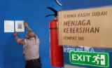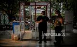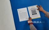 REPUBLIKA.CO.ID,JAKARTA -- Petugas memasang stiker pengaduan PPKM di Pasar Santa, Jakarta, Kamis (2/9).