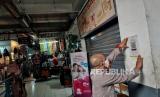 Petugas memasang stiker pengaduan PPKM di Pasar Santa, Jakarta, Kamis (2/9). Berbagai upaya dilakukan pedagang Pasar Santa untuk menarik pelanggan pada masa PPKM level 3 dengan menerapkan stiker vaksin di beberapa ruko, menyediakan fasilitas disinfektan sebelum masuk pasar, serta mengimbau pedagang dan pengunjung untuk menerapkan protokol kesehatan yang ketat.Republika/Thoudy Badai (FOTO : Republika/Thoudy Badai)