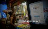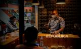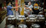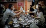Pemilik kedai kopi Suradi (45) melayani pembeli di kedai kopi di Pasar Santa, Jakarta, Kamis (2/9). Berbagai upaya dilakukan pedagang Pasar Santa untuk menarik pelanggan pada masa PPKM level 3 dengan menerapkan stiker vaksin di beberapa ruko, menyediakan fasilitas disinfektan sebelum masuk pasar, serta mengimbau pedagang dan pengunjung untuk menerapkan protokol kesehatan yang ketat.Republika/Thoudy Badai (FOTO : Republika/Thoudy Badai)