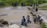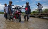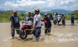 REPUBLIKA.CO.ID, SIGI -- Warga mengangkat sepeda motor melintasi jalan yang ditutupi luapan air sungai di Desa Jono Oge, Sigi, Sulawesi Tengah, Kamis (2/9/2021). Jalan yang menghubungkan sejumlah kecamatan di Kabupaten Sigi itu terendam air luapan sungai setelah diguyur hujan deras dengan intensitas yang cukup tinggi sejak Selasa (31/8) lalu.