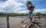 Seorang warga meniti jembatan darurat untuk menghindari luapan air sungai yang menutupi jalan di Desa Jono Oge, Sigi, Sulawesi Tengah, Kamis (2/9/2021). Jalan yang menghubungkan sejumlah kecamatan di Kabupaten Sigi itu terendam air luapan sungai setelah diguyur hujan deras dengan intensitas yang cukup tinggi sejak Selasa (31/8) lalu. (FOTO : ANTARA/BASRI MARZUKI)