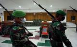 REPUBLIKA.CO.ID, SORONG -- Prajurit TNI berjalan di dekat peti jenazah rekannya saat disemayamkan di Aula Praja Vira Tama Markas Komando Korem 181/PVT Kota Sorong, Papua Barat, Kamis (2/9/21). Empat jenazah prajurit TNI AD, korban penyerangan Kelompok Saparatis Teroris (KST) di Pos persiapan Koramil Kisor Distrik Aifat, Kabupaten Maybrat, Papua Barat tiba dan disemayamkan di Kota Sorong untuk selanjutnya akan diterbangkan ke daerah masing-masing.