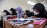 REPUBLIKA.CO.ID, BANDUNG -- Sejumlah santriwati mengikuti simulasi pembelajaran tatap muka (PTM) di Pondok Pesantren Nurul Iman, Cibaduyut, Kota Bandung, Jumat (3/9). Pemerintah Kota Bandung berencana akan menggelar pembelajaran tatap muka (PTM) secara terbatas pada 8 September mendatang dengan menerapkan protokol kesehatan pencegahan Covid-19 secara ketat. Foto