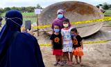Warga berfoto saat menonton temuan wajan raksasa di Kalurahan Jambidan, Bantul, Yogyakarta, Jumat (3/9). Wajan raksasa dengan diameter 2,5 meter ini ditemukan saat pembangunan lapangan sepak bola desa. Menurut warga sekitar wajan raksasa ini berfungsi untuk mencegah tanah amblas akibat mempompa air dari dalam tanah. Saat ini lokasi penemuan wajan raksasa menjadi lokasi piknik dadakan warga. (FOTO : Wihdan Hidayat / Republika)