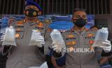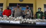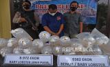 REPUBLIKA.CO.ID, MERAK -- Polisi menjaga BY (tengah), tersangka pemilik ribuan benih lobster yang akan diselundupkan ke luar negeri saat ekspos di Mapolairud Polda Banten, di Merak, Jumat (3/9/2021). Jajaran Polairud Polda Banten berhasil menggagalkan penyelundupan 9.382 ekor benih lobster yang terdiri dari jenis lobster pasir dan lobster mutiara.