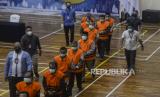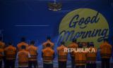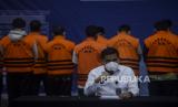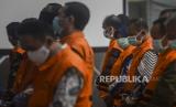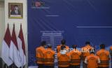 Sejumlah tersangka memakai rompi tahanan saat dihadirkan pada konferensi pers di Gedung KPK, Jakarta, Sabtu (4/9). KPK menahan 17 tersangka terkait kasus dugaan suap jual beli jabatan di lingkungan Pemerintah Kabupaten Probolinggo, Jawa Timur, setelah sebelumnya KPK menahan Bupati Probolinggo Puput Tantriana Sari dan Suaminya anggota DPR periode 2019-2024 Hasan Aminuddin dalam operasi tangkap tangan pada Senin (30/8) lalu. Republika/Putra M. Akbar (FOTO : Republika/Putra M. Akbar)
