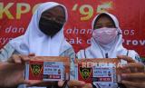 Pelajar menunjukkan kartu voucher untuk belanja usai penyerahan bantuan paket sembako untuk warga terdampak COVID-19 di Serang, Banten, Jumat (3/9/2021). Acara tersebut berlangsung saat Bakti Sosial Akademi Kepolisian Batalion Patriatama angkatan 1995 dengan membagikan 5.000 paket sembako dan 3.000 voucher belanja kepada warga terdampak pandemi. (FOTO : ANTARA/Asep Fathulrahman)
