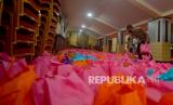 Personel kepolisian menyiapkan bansos bagi warga yang sudah divaksin di Kampus Universitas Negeri Padang (UNP), Padang, Sumatera Barat, Jumat (3/9/2021). Akpol 95 Patriatama menggelar vaksinasi serentak COVID-19 di 13 provinsi dengan target 40 ribu orang dan pembagian 27 ribu bantuan sosial (bansos) khususnya bagi akademisi, mahasiswa, dan warga di lingkungan Kampus UNP. (FOTO : Antara/Iggoy el Fitra)