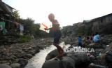 REPUBLIKA.CO.ID, Anak-anak bermain di sungai Ciliwung, Kelurahan Babakan Pasar, Kota Bogor, Jawa Barat, Jumat (3/9/2021). Debit air sungai Ciliwung yang menyusut di musim kemarau dimanfaatkan warga untuk berbagai aktivitas termasuk lahan bermain anak.