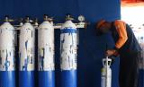 Petugas melakukan pengisian ulang tabung oksigen secara gratis yang disediakan Pemprov Jawa Timur di Posko Pengisian Oksigen Gratis di halaman Kantor Bakorwil I Madiun, Jawa Timur, Sabtu (4/9/2021). Menurut petugas, permintaan pengisian ulang tabung oksigen gratis bagi warga yang menjalani isolasi mandiri saat ini mengalami penurunan dibanding pada awal beroperasinya layanan 10 Agustus lalu dari rata-rata 60 tabung menjadi 40 tabung ukuran satu meter kubik per hari seiring menurunnya jumlah kasus COVID-19. (FOTO : ANTARA/SISWOWIDODO)