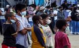 Sejumlah bocah menyaksikan hiburan saat Gebyar PON XX Papua Kluster Kota Jayapura di Lapangan Karang Papua Trade Center (PTC) Entrop, Kota Jayapura, Papua, Sabtu (4/9/2021). Gebyar PON XX Papua Kluster Kota Jayapura tersebut menghadirkan hiburan penyanyi nasional, lokal, stan kreatif kuliner UMKM se-Kota Jayapura dengan tetap menerapkan protokol kesehatan COVID-19. (FOTO : ANTARA/Indrayadi TH)