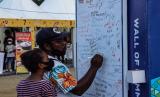 Seorang pengunjung menandatangani dukungan penyelenggaraan Pekan Olahraga Nasional (PON) saat Gebyar PON XX Papua Kluster Kota Jayapura di Lapangan Karang Papua Trade Center (PTC) Entrop, Kota Jayapura, Papua, Sabtu (4/9/2021). Gebyar PON XX Papua Kluster Kota Jayapura tersebut menghadirkan hiburan penyanyi nasional, lokal, stan kreatif kuliner UMKM se-Kota Jayapura dengan tetap menerapkan protokol kesehatan COVID-19. (FOTO : ANTARA/Indrayadi TH)