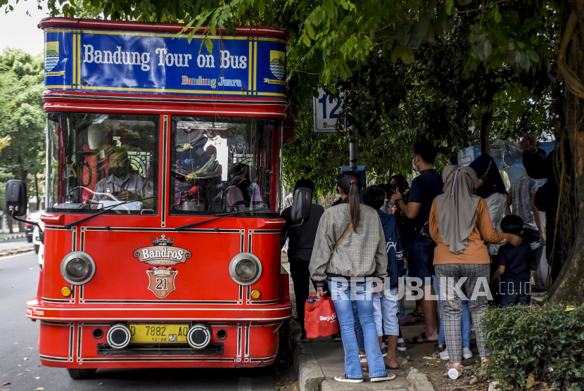 Sejumlah penumpang mengantre untuk menaiki bus Bandung Tour On Bus (BANDROS) di Halte Bus Bandros di Jalan Diponegoro, Ahad (5/9). Bus wisata Bandung Tour On Bus (BANDROS) kembali beroperasi secara terbatas dengan menerapkan protokol kesehatan pencegahan Covid-19, seiring dengan menurunnya status Pemberlakuan Pembatasan Kegiatan Masyarakat (PPKM) di Kota Bandung menjadi Level 3. Foto: Republika/Abdan Syakura (FOTO : REPUBLIKA/ABDAN SYAKURA)