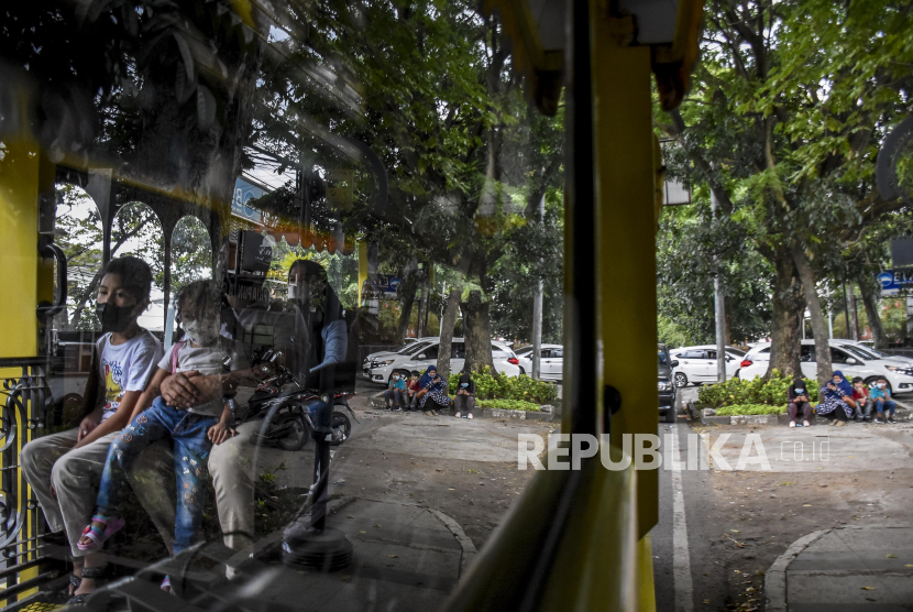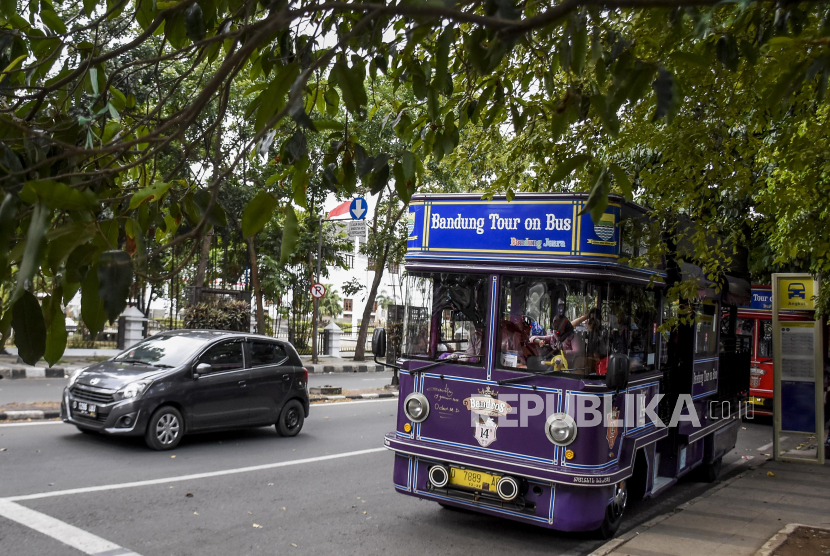Sejumlah penumpang berada di dalam bus Bandung Tour On Bus (BANDROS) di Halte Bus Bandros di Jalan Diponegoro, Ahad (5/9). Bus wisata Bandung Tour On Bus (BANDROS) kembali beroperasi secara terbatas dengan menerapkan protokol kesehatan pencegahan Covid-19, seiring dengan menurunnya status Pemberlakuan Pembatasan Kegiatan Masyarakat (PPKM) di Kota Bandung menjadi Level 3. Foto: Republika/Abdan Syakura (FOTO : REPUBLIKA/ABDAN SYAKURA)
